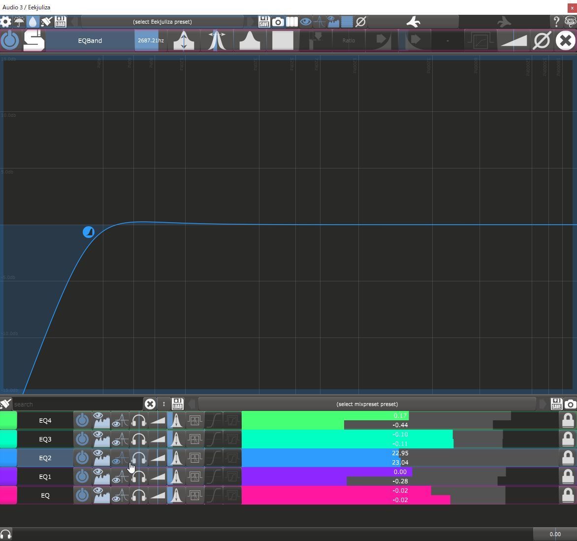 マルチ表示のアナライザは普通によくありますが、このEekjulizaは1枚で複数トラックを表示させ 各トラックのEQも一括して操作できます。