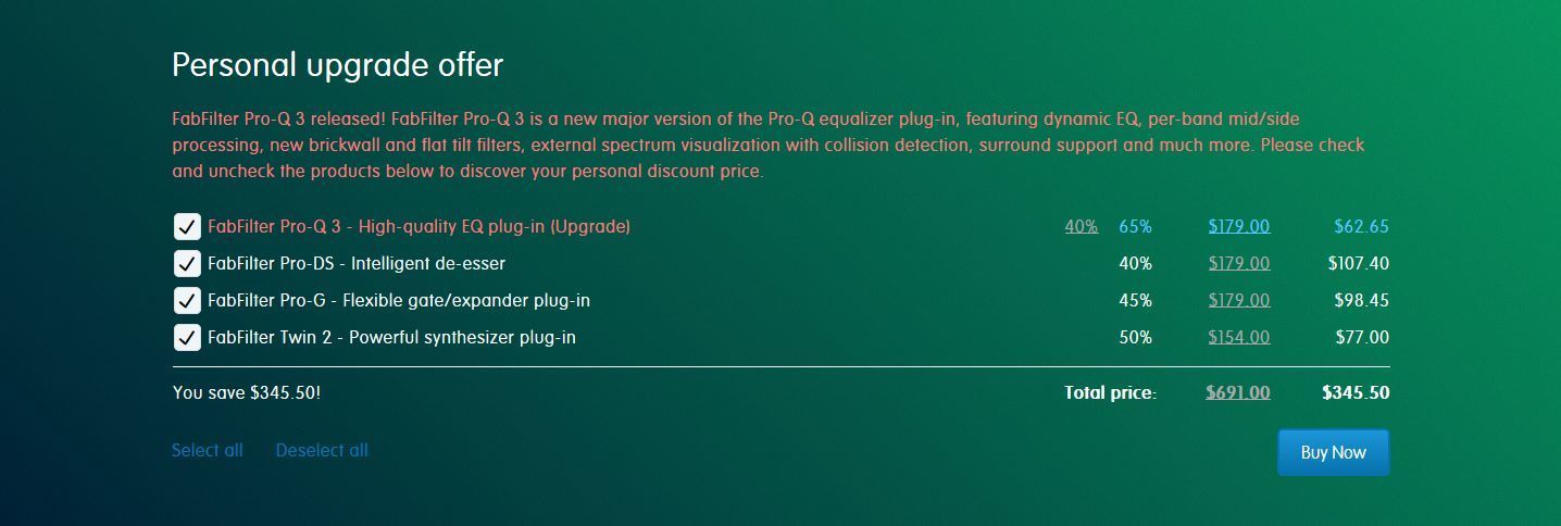 このスクショの通り残り3本の所持本数でPro-Q3のアプデ料金は65%引きの62.65ドル。